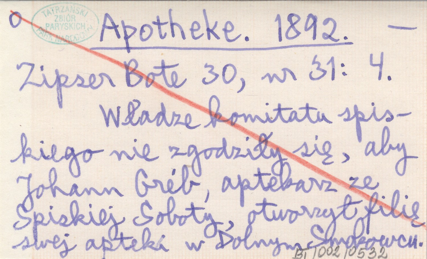 Zipser Bote, 30, nr 31: 4. Władze komitatu spiskiego nie zgodziły się, aby Johann Gréb, aptekarz ze Spiskiej Soboty, otworzył filię swej apteki w Dolnym Smokowcu.