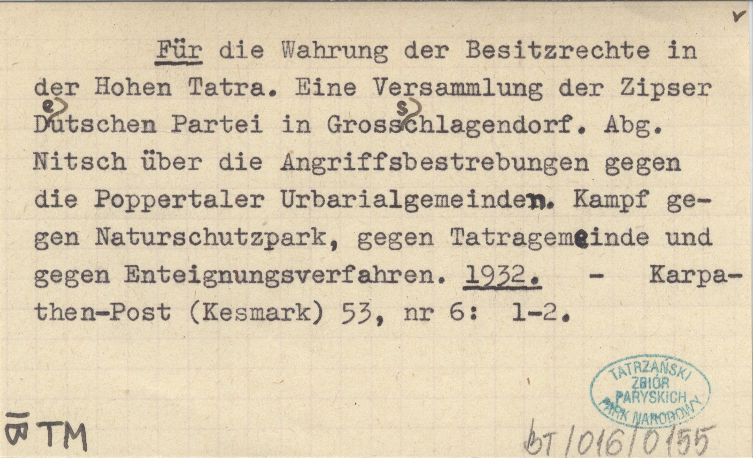 Für die Wahrung der Besitzrechte in der Hohen Tatra. Eine Versammlung der Zipser Deutschen Partei in Grossschlagendorf. Abg. Nitsch über die Angriffsbestrebungen gegen die Poppertaler Urbarialgemeinden. Kampf gegen Naturschutzpark, gegen Tatragemeinde und gegen Enteignungsverfahren. 1932