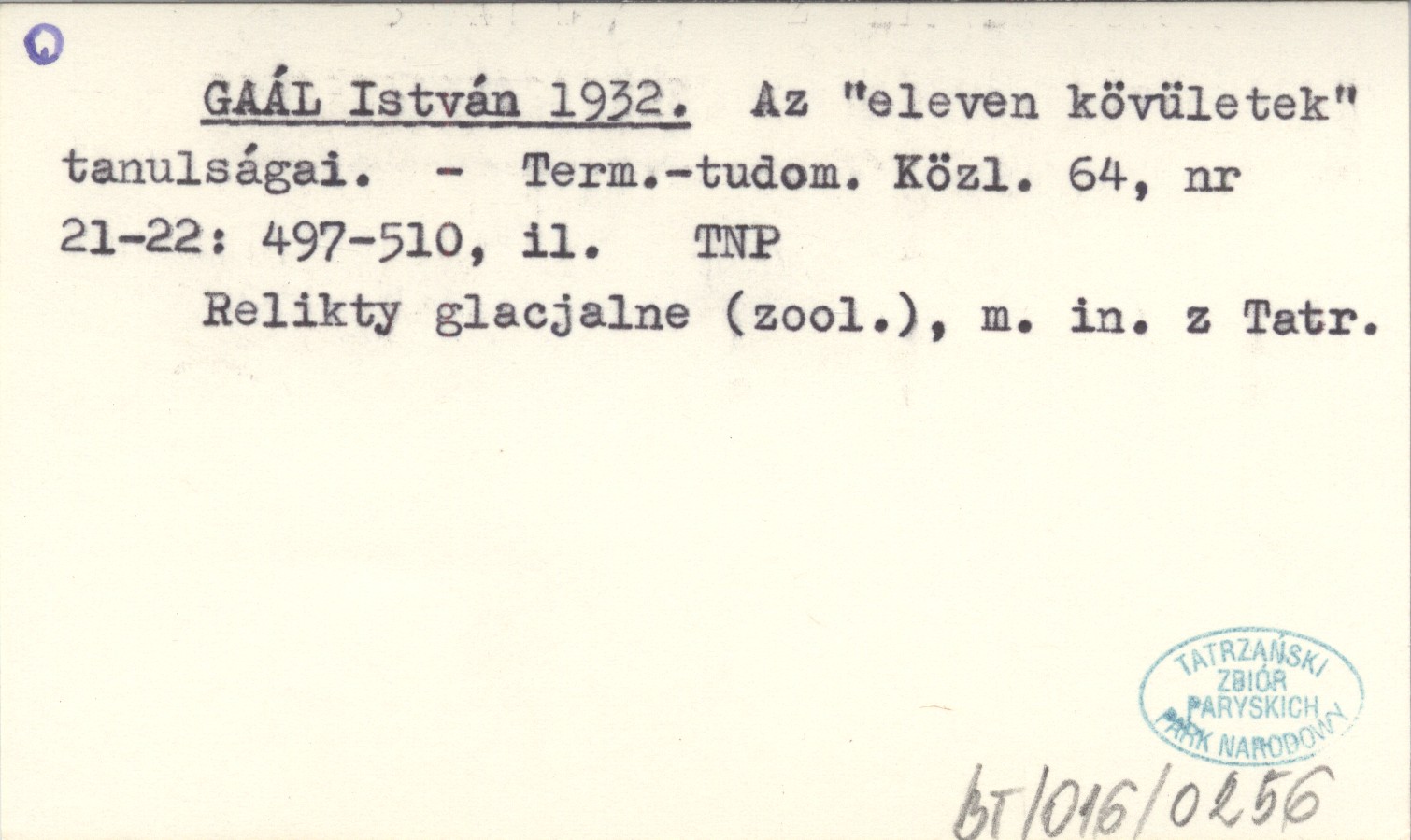 Természet-tudományi Közlöny, 64, nr 21-22: 497-510, il. Relikty glacjalne (zool.), m.in. z Tatr.