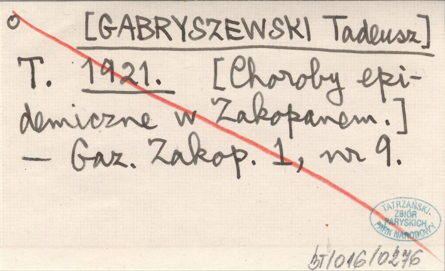 T. [GABRYSZEWSKI Tadeusz] 1921 [Choroby epidemiczne w Zakopanem.].
