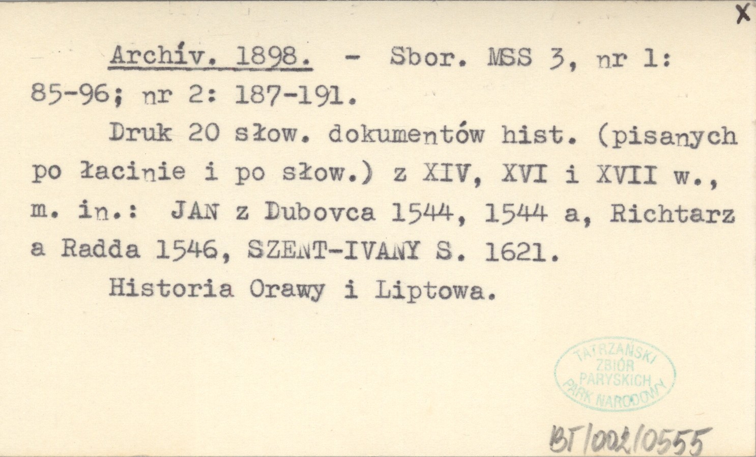 Sborník Muzeálnej slovenskej spoločnosti, 3, nr 1: 85-96 ; nr 2: 187-191. Historia Orawy i Liptowa. Druk 20 słow. dokumentów hist. (pisanych po łacinie i po słow.) z XIV, XVI i XVII w., m. in.: JAN z Dubovca 1544, 1544 a, Richtarz a Radda 1956, SZENT-IVAN S. 1621.