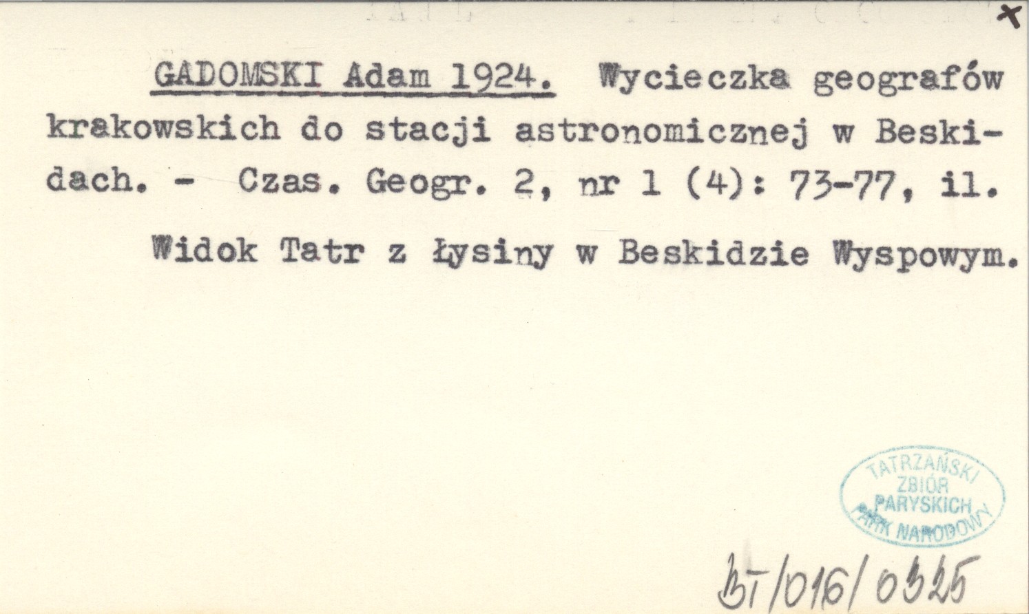 GADOMSKI Adam 1924 Wycieczka geografów krakowskich do stacji astronomicznej w Beskidach.