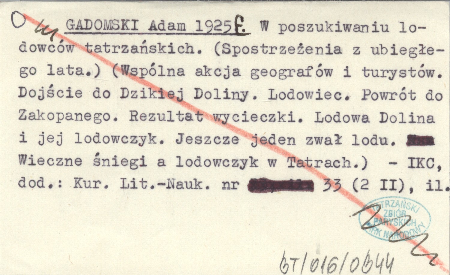 GADOMSKI Adam 1925 f W poszukiwaniu lodowców tatrzańskich. (Spostrzeżenia z ubiegłego lata.)(Wspólna akcja geografów i turystów. Dojście do Dzikiej Doliny. Lodowiec. Powrót do Zakopanego. Rezultat wycieczki. Lodowa Dolina i jej lodowczyk. Jeszcze jeden zwał lodu. Wieczne śniegi a lodowczyk w Tatrach.).