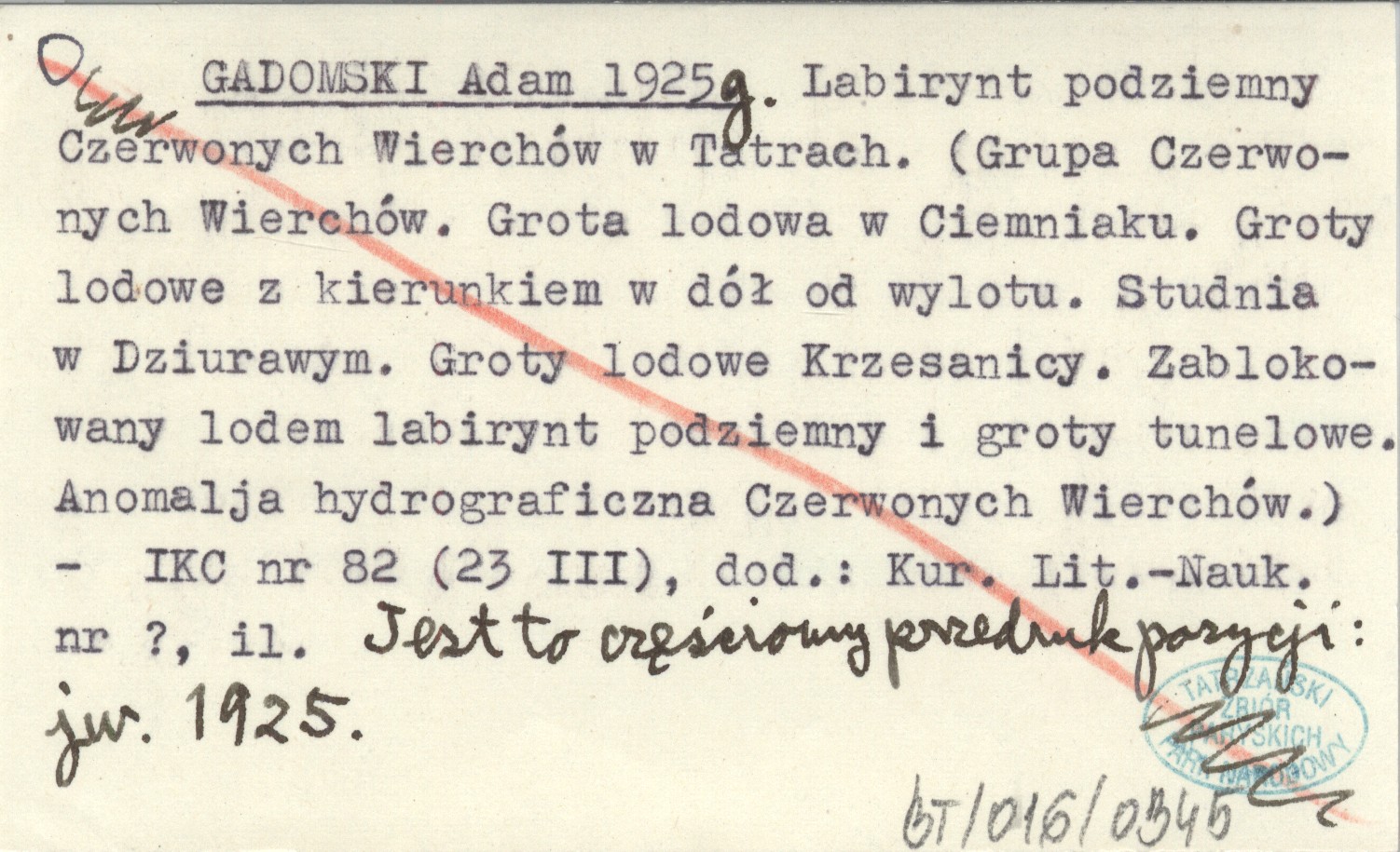 GADOMSKI Adam 1925 g Labirynt podziemny Czerwonych Wierchów w Tatrach. (Grupa Czerwonych Wierchów. Grota lodowa w Ciemniaku. Groty lodowe z kierunkiem w dół od wylotu. Studnia w Dziurawym. Groty lodowe Krzesanicy. Zablokowany lodem labirynt podziemny i groty tunelowe. Anomalja hydrograficzna Czerwonych Wierchów.)