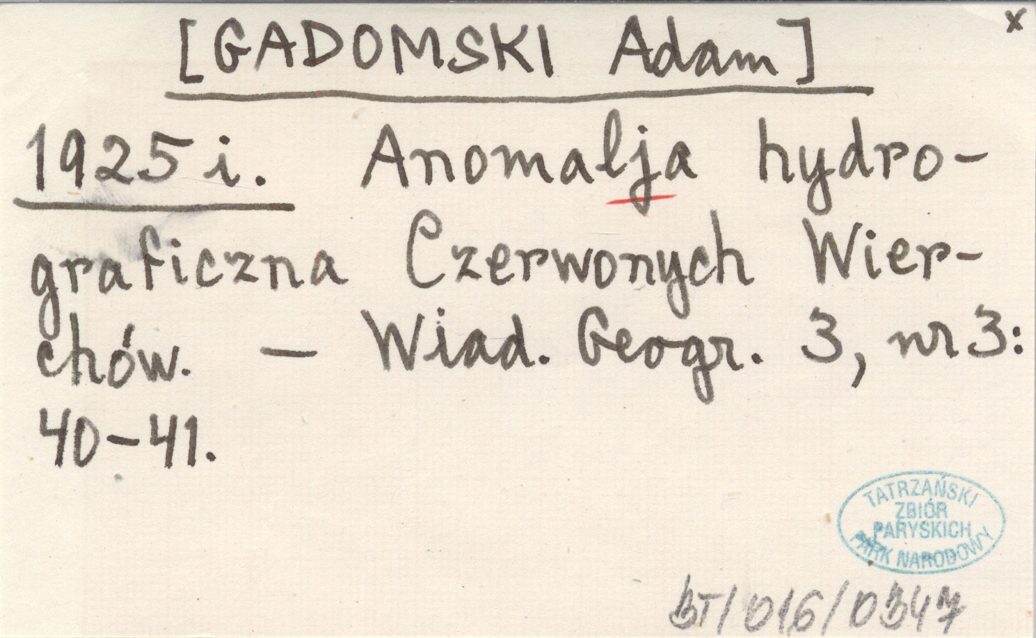 [GADOMSKI Adam] 1925 i Anomalja hydrograficzna Czerwonych Wierchów.