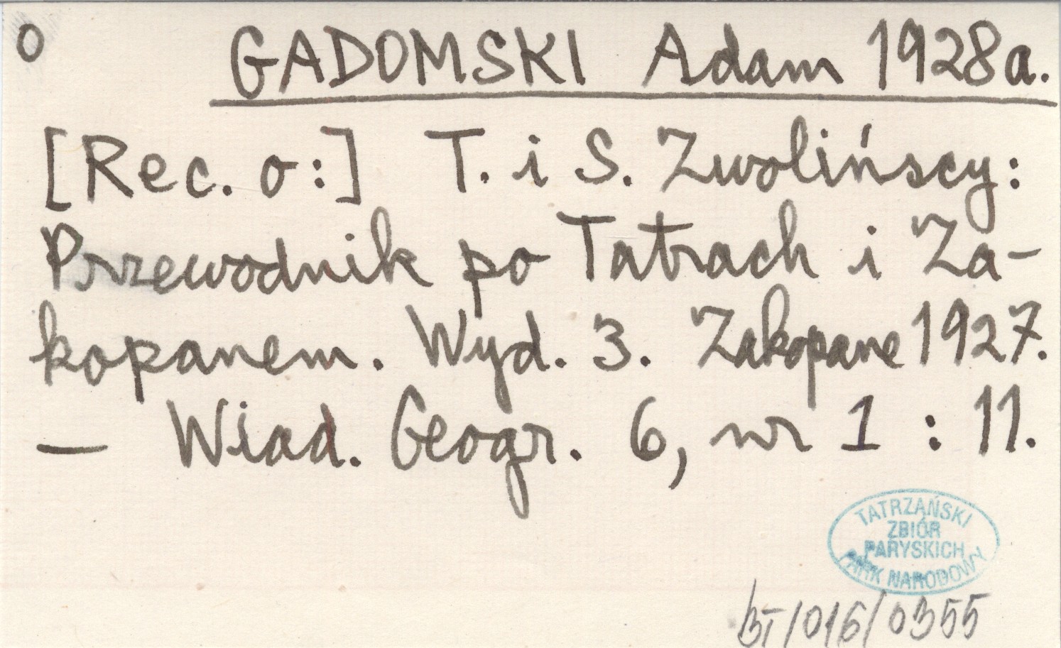 GADOMSKI Adam 1928 a T. i S. Zwolińscy: Przewodnik po Tatrach i Zakopanem. Zakopane 1927.
