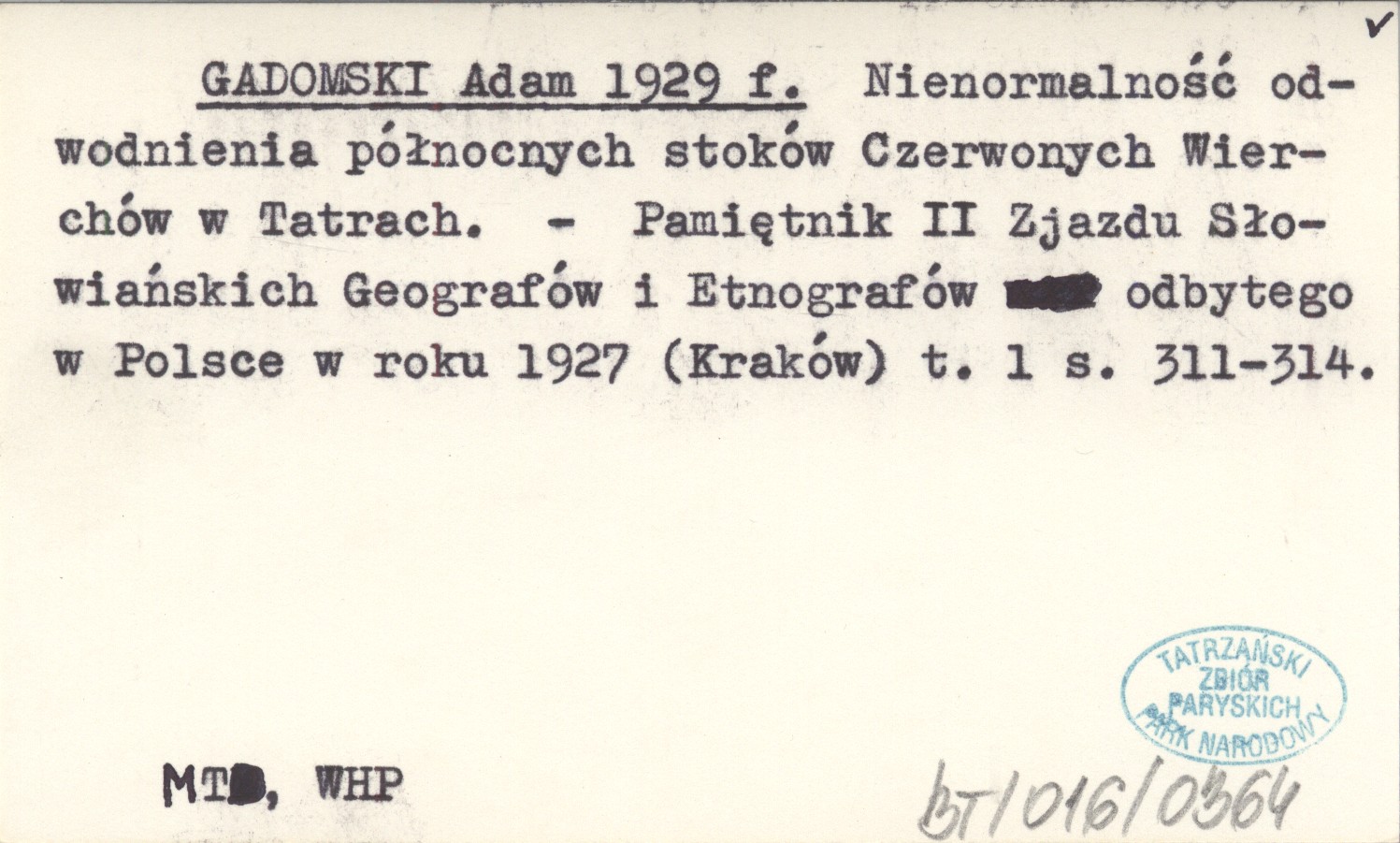 GADOMSKI Adam 1929 f Nienormalność odwodnienia północnych stoków Czerwonych Wierchów w Tatrach.