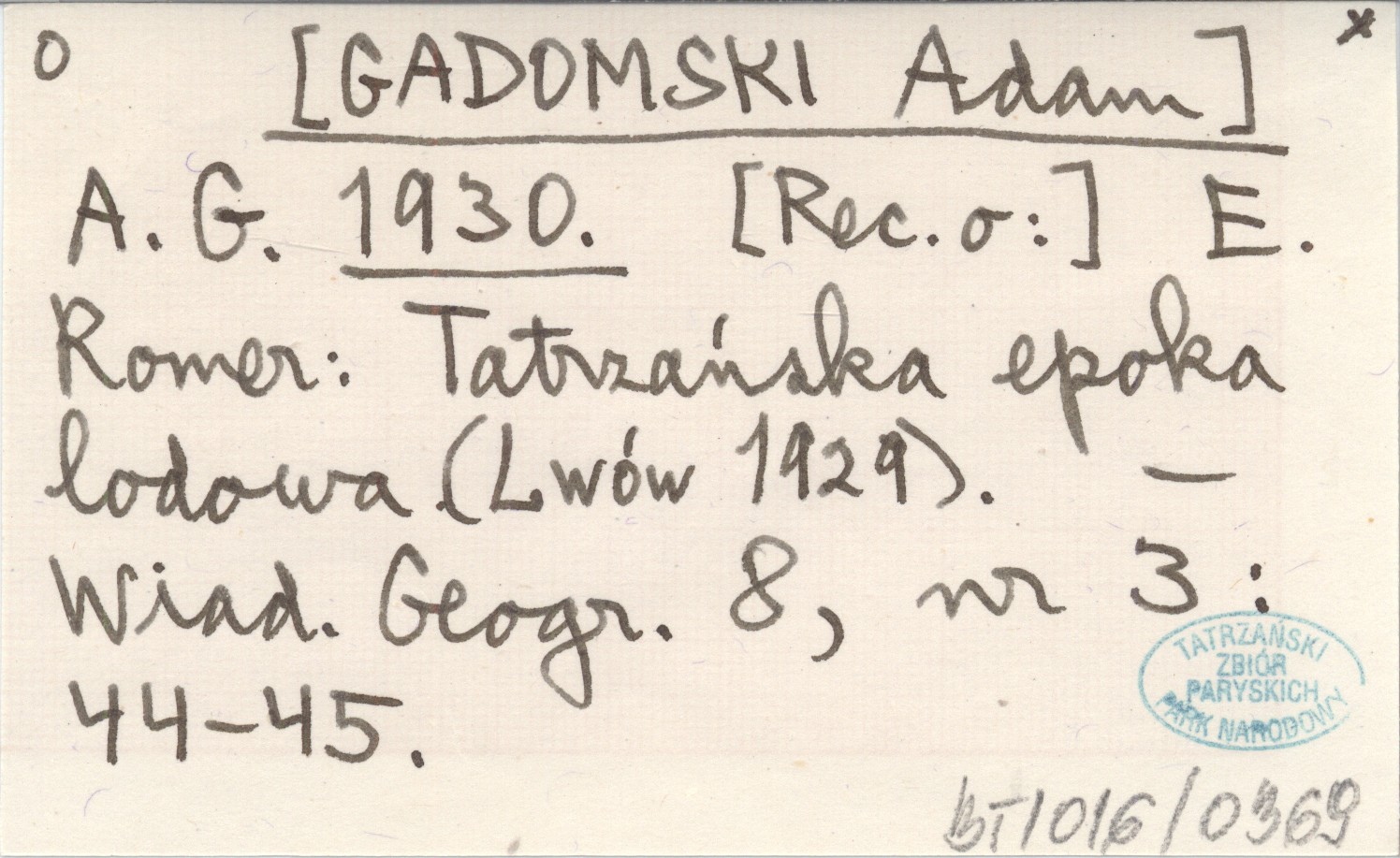 A. G. [GADOMSKI Adam] 1930 E. Romer: Tatrzańska epoka lodowa (Lwów 1929).
