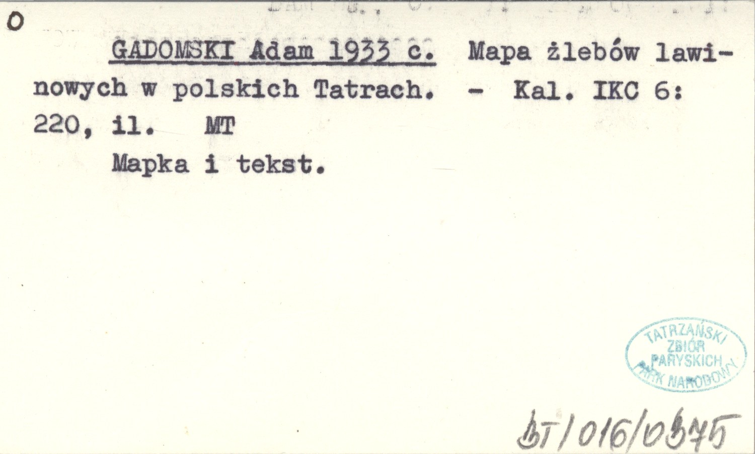 GADOMSKI Adam 1933 c Mapa żlebów lawinowych w polskich Tatrach.