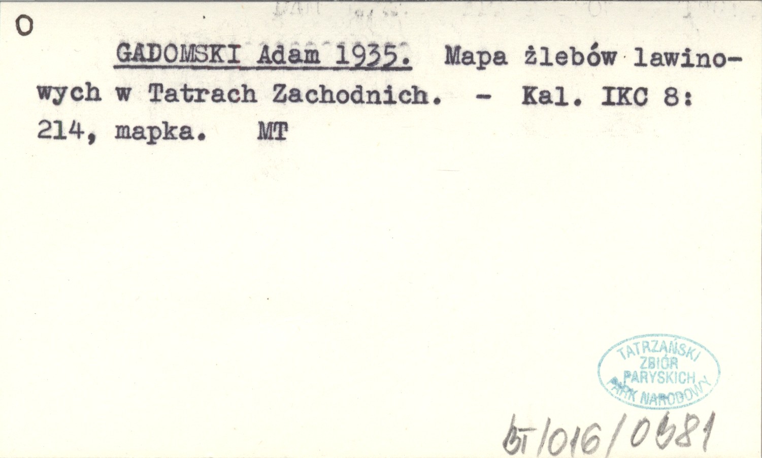 GADOMSKI Adam 1935 Mapa żlebów lawinowych w Tatrach Zachodnich.
