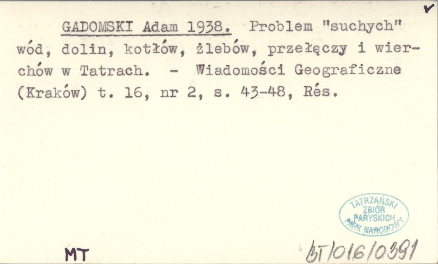 GADOMSKI Adam 1938 Problem "suchych" wód, dolin, kotłów, żlebów, przełęczy i wierchów w Tatrach.