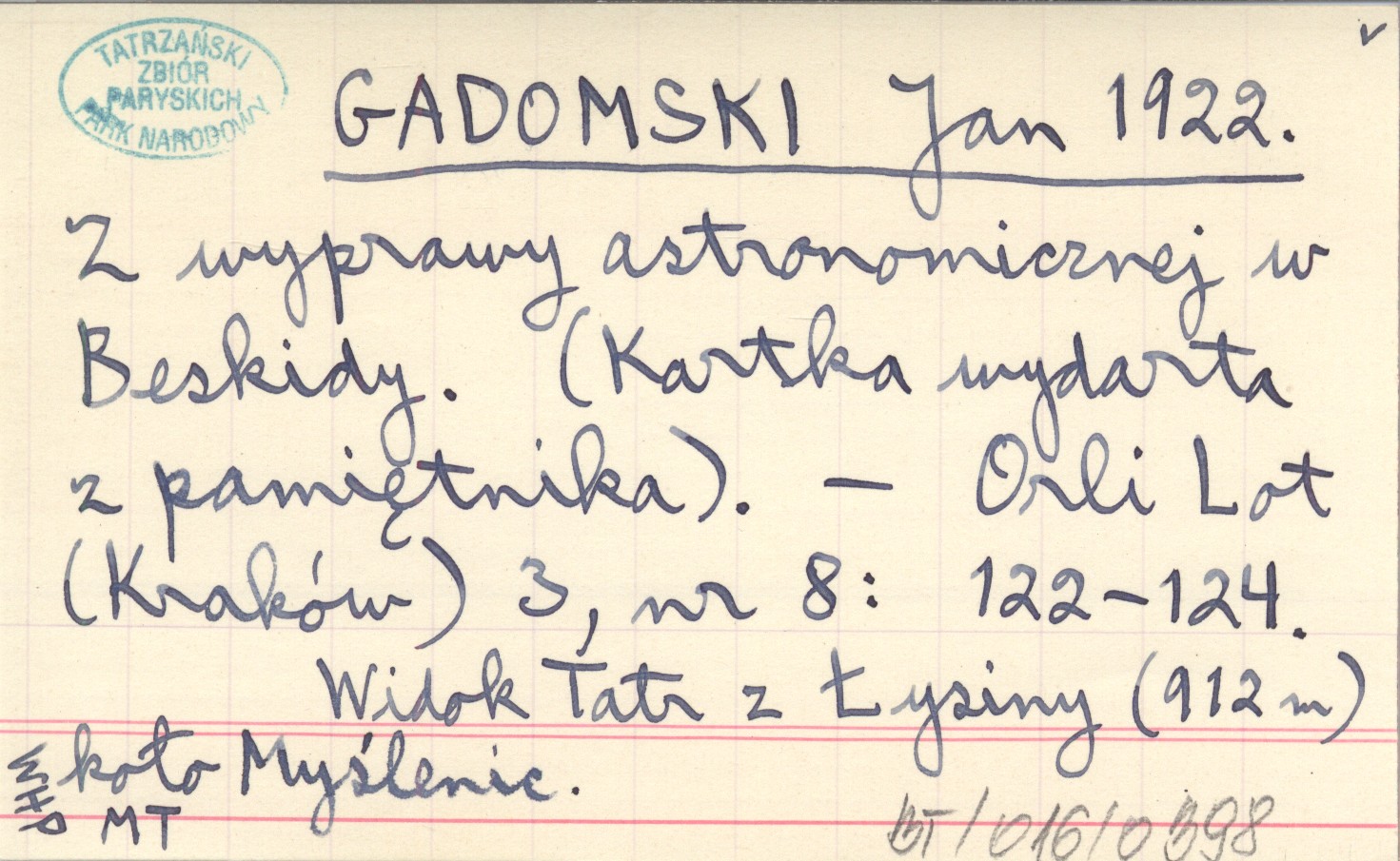 GADOMSKI Jan 1922 Z wyprawy astronomicznej w Beskidy. (Kartka wydarta z pamiętnika).