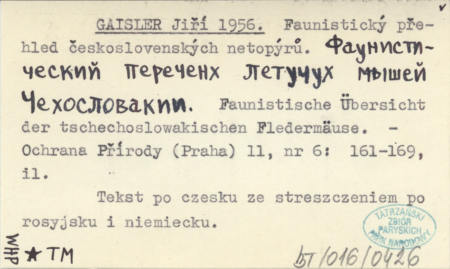 GAISLER Jiří 1956 Faunistický přehled československých netopýrů. Faunističeskij perečench letučuch myąej Čechoslovakii. Faunistische Übersicht der tschechoslowakischen Fledermäuse.