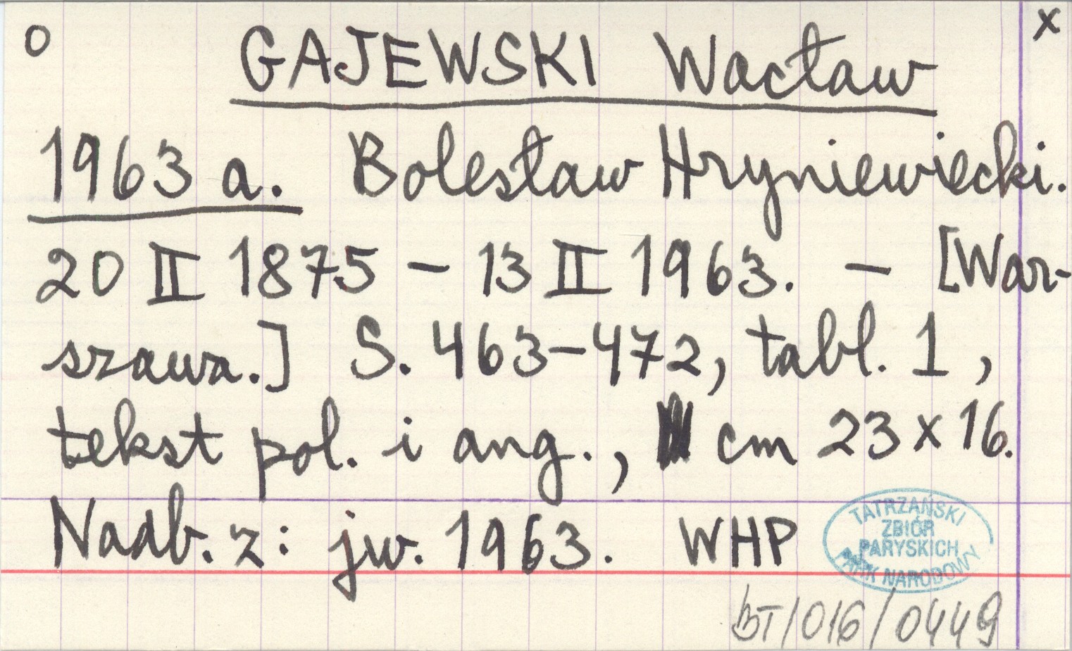 GAJEWSKI Wacław 1963 a Bolesław Hryniewiecki. 20 II 1875 - 13 II 1963.