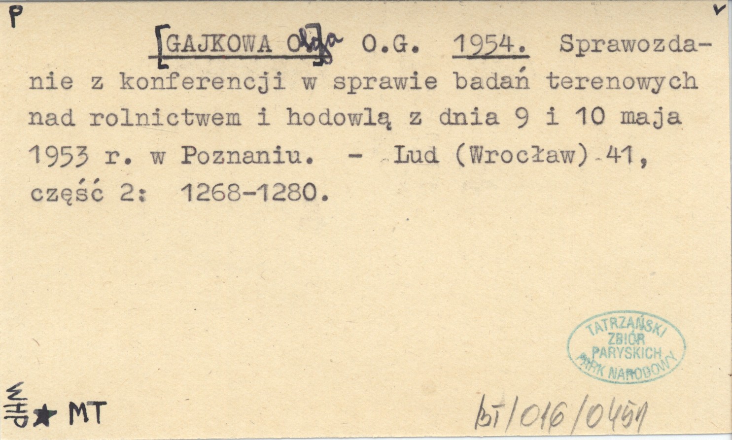 O.G. [GAJKOWA Olga] 1954 Sprawozdanie z konferencji w sprawie badań terenowych nad rolnictwem i hodowlą z dnia 9 i 10 maja 1953 r. w Poznaniu.