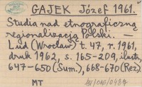 GAJEK Józef 1961 Studia nad etnograficzną regionalizacją Polski.