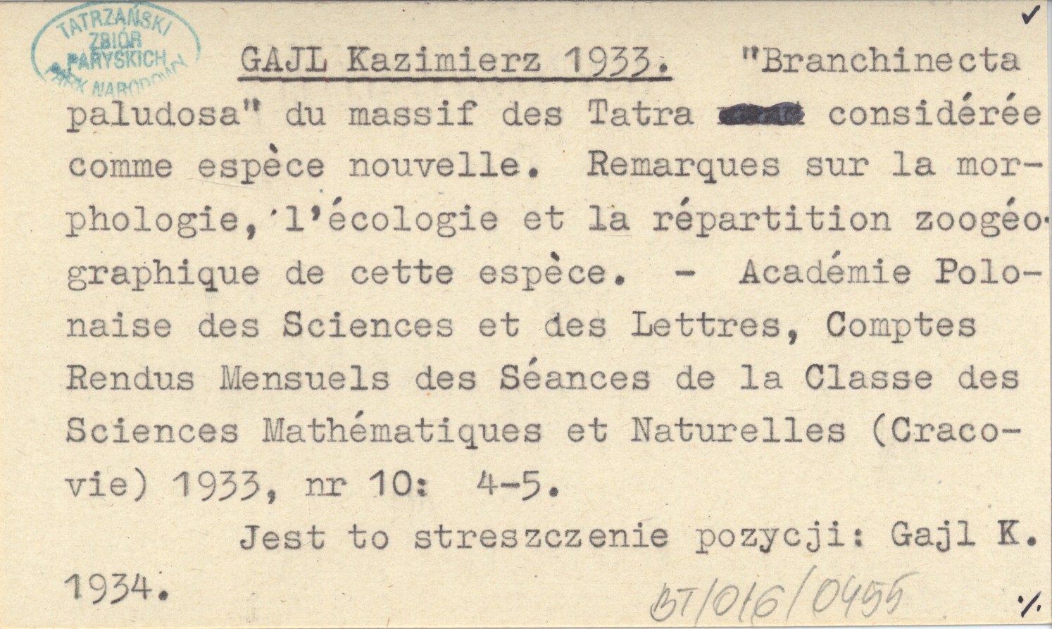 GAJL Kazimierz 1933 "Branchinecta paludosa" du massif des Tatra considérée comme espéce nouvelle. Remarques sur la morphologie, l'écologie et la répartition zoogéographique de cette espéce.