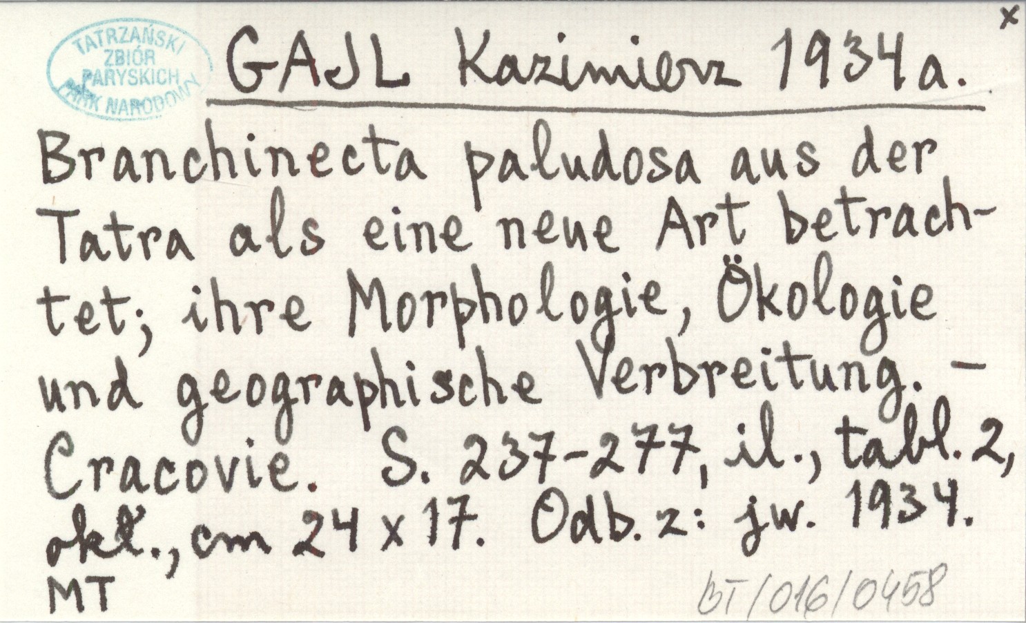 GAJL Kazimierz 1934 a Branchinecta paludosa aus der Tatra als eine neue Art betrachtet; ihre Morphologie, Ökologie und geographische Verbreitung.