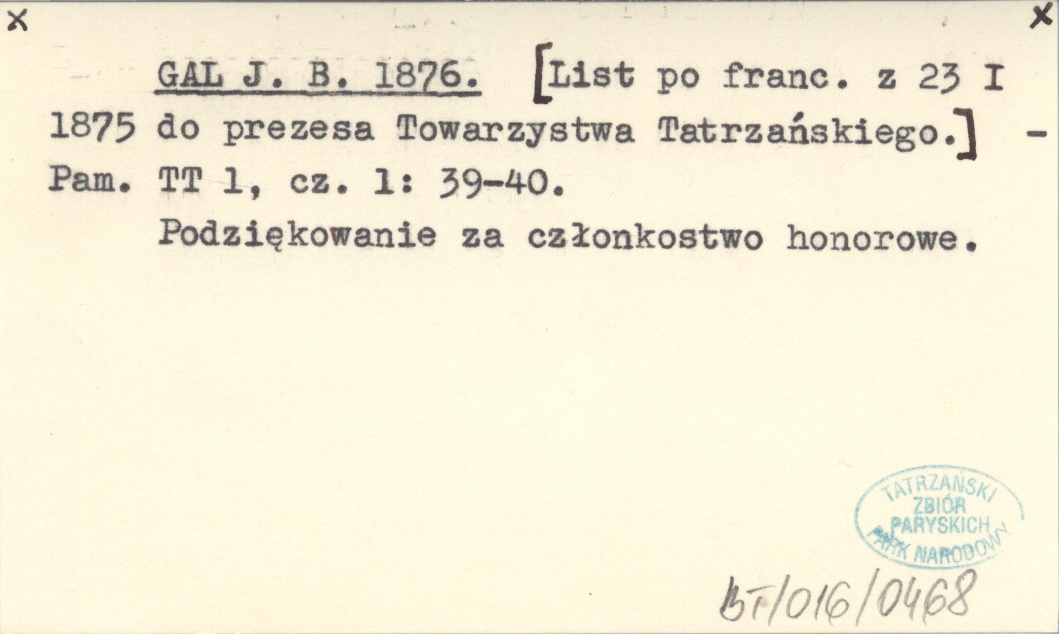 GAL J. B. 1876 [List po franc. z 23 I 1875 do prezesa Towarzystwa Tatrzańskiego.].
