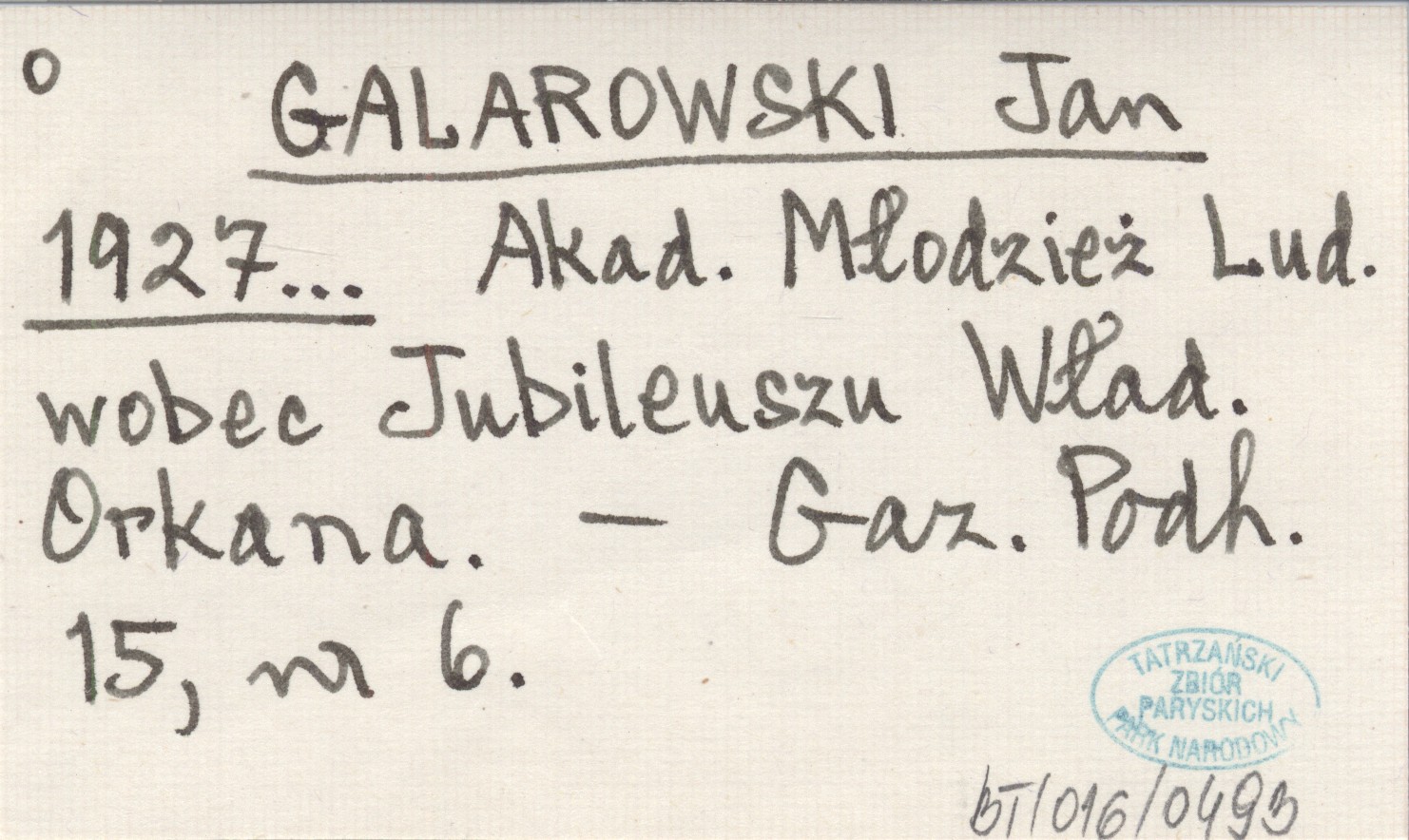 GALAROWSKI Jan 1927... Akad. Młodzież Lud. wobec Jubileuszu Wład. Orkana.