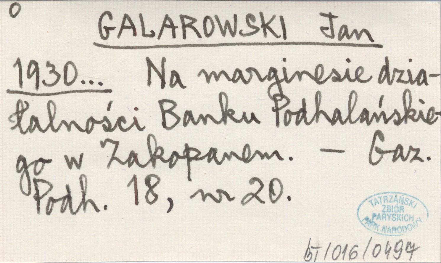 GALAROWSKI Jan 1930... Na marginesie działalności Banku Podhalańskiego w Zakopanem.