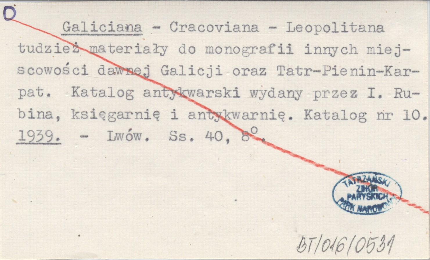 Galiciana - Cracoviana - Leopolitana tudzież materiały do monografii innych miejscowości dawnej Galicji oraz Tatr-Pienin-Karpat. Katalog antykwarski wydany przez I. Rubina, księgarnię i antykwarnię. Katalog nr 10. 1939