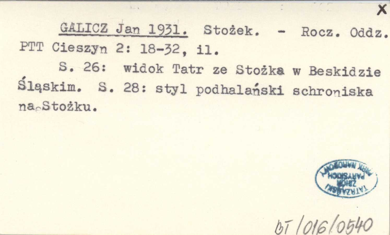 Rocznik Oddziału PTT Cieszyn, 2: 18-32, il. S. 26: widok Tatr ze Stożka w Beskidzie Śląskim. S. 28: styl podhalański schroniska na Stożku.