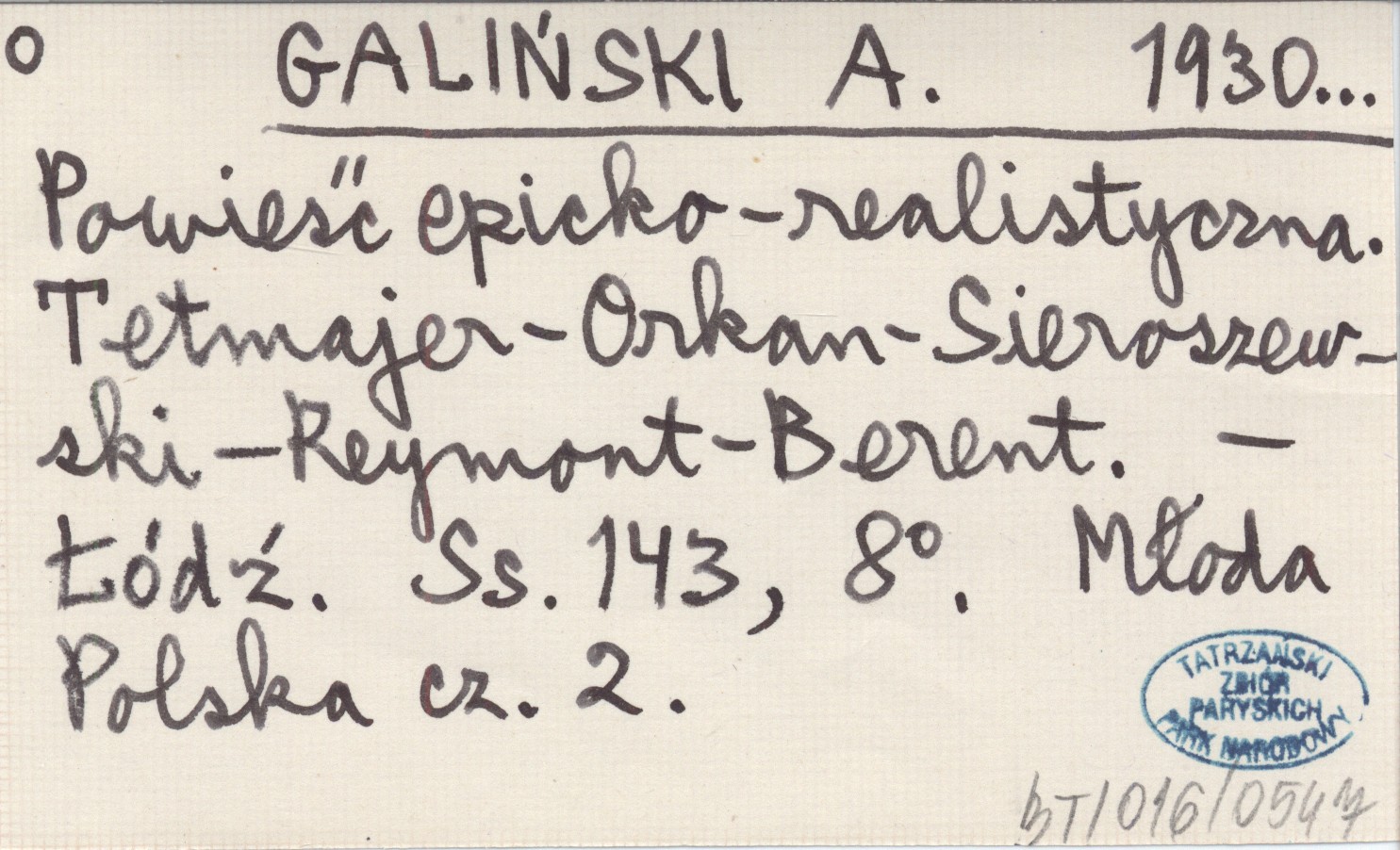 GALIŃSKI A. 1930... Powieść epicko-realistyczna. Tetmajer-Orkan-Sieroszewski-Reymont-Berent.