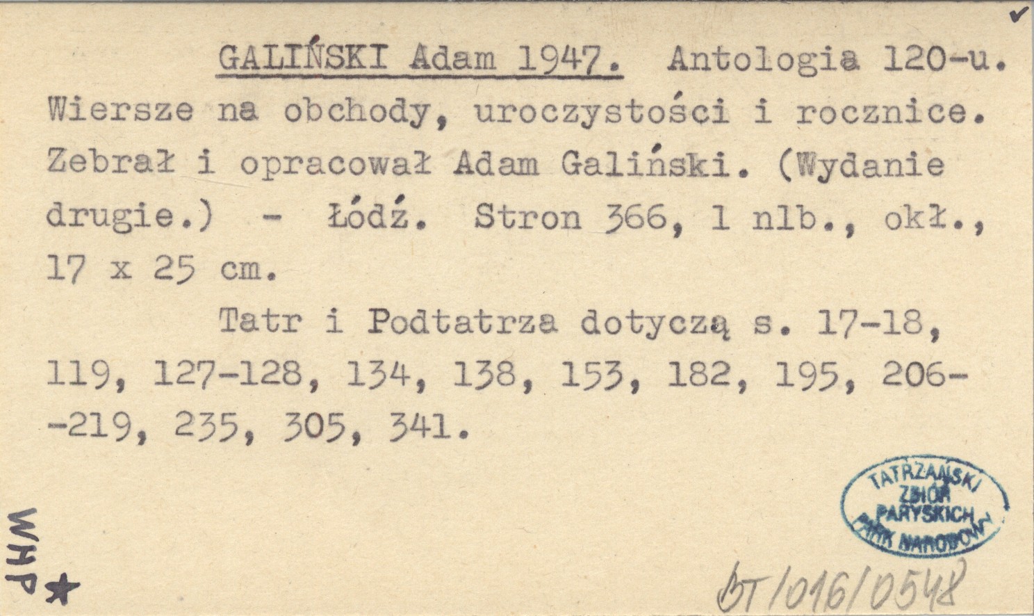 GALIŃSKI Adam 1947 Antologia 120-u. Wiersze na obchody, uroczystości i rocznice. Zebrał i opracował Adam Galiński.