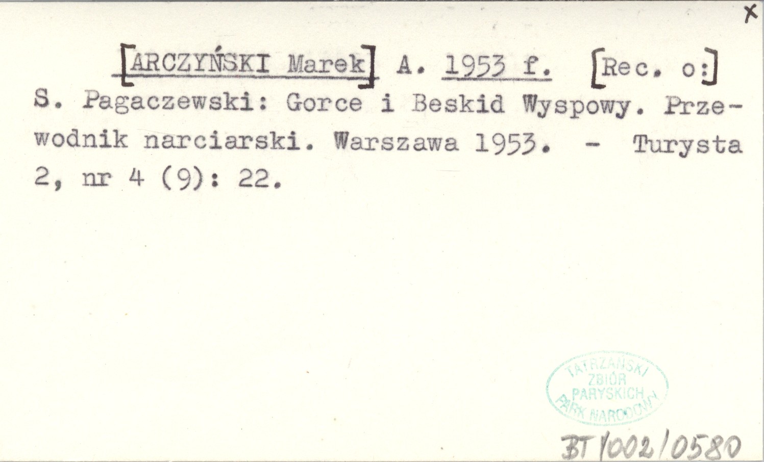 A. [ARCZYŃSKI Marek] 1953 f [Rec. o:] S. Pagaczewski: Gorce i Beskid Wyspowy. Przewodnik narciarski. Warszawa 1953.