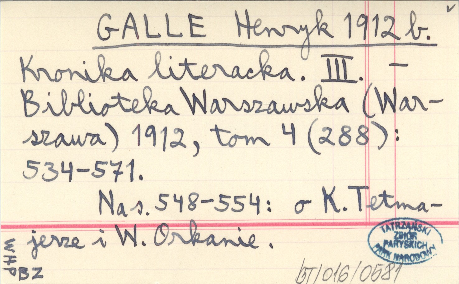 Biblioteka Warszawska (Warszawa) , T. 4 (288): 534-571. Na s. 548-554: o K. Tetmajerze i W. Orkanie.