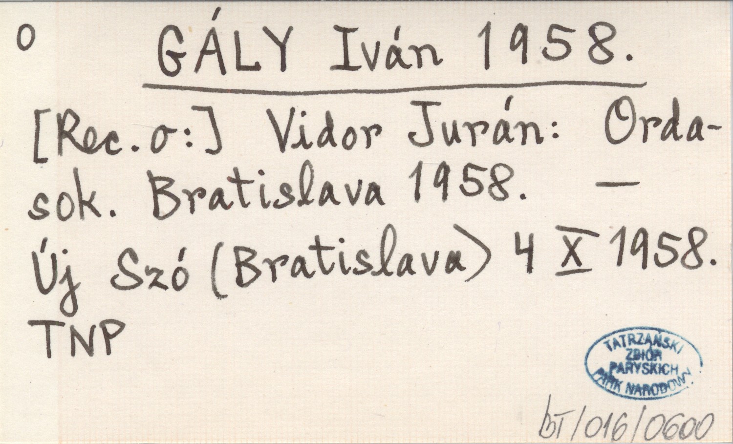 GÁLY Iván 1958 Vidor Jurán: Ordasok. Bratislava 1958.