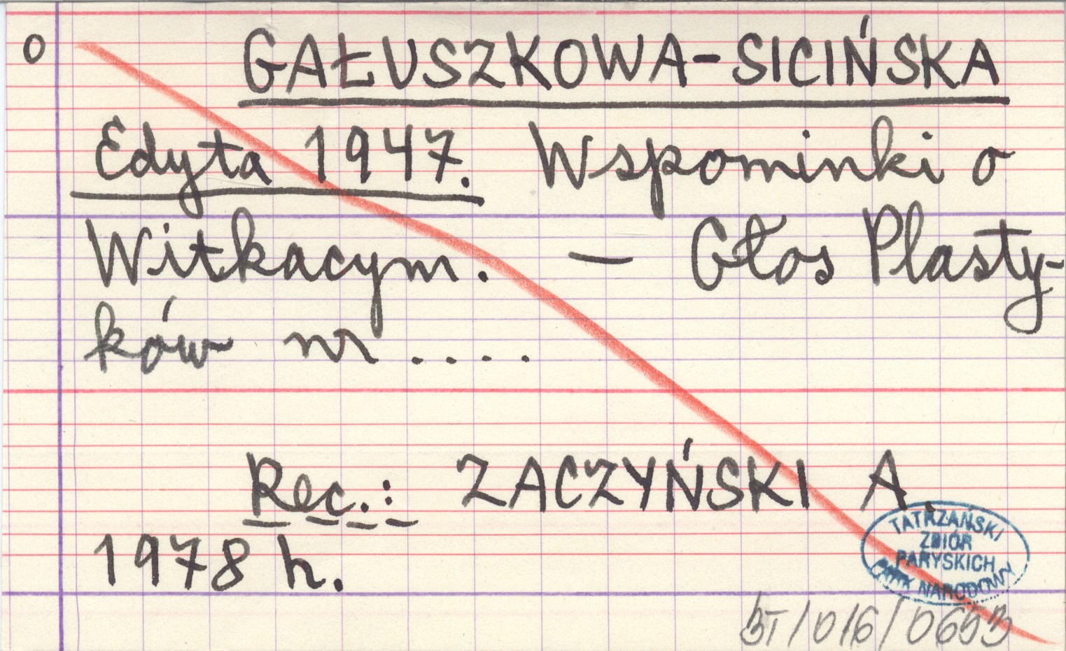 GAŁUSZKOWA-SICIŃSKA Edyta 1947 Wspominki o Witkacym.