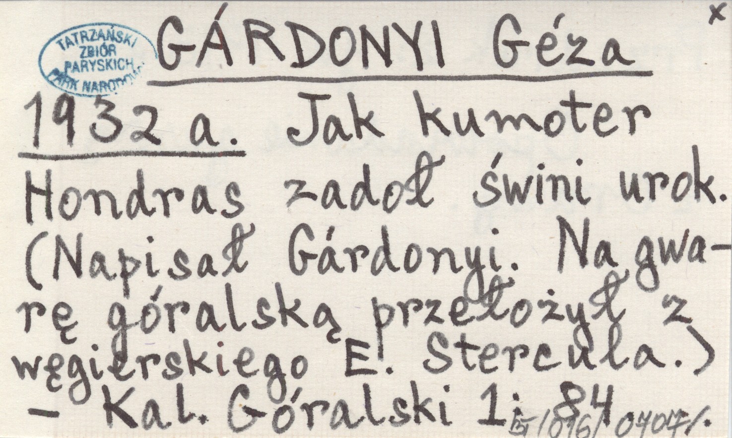 GÁRDONYI Géza 1932 a Jak kumoter Hondras zadoł świni urok. (Napisał Gárdonyi. Na gwarę góralską przełożył z węgierskiego E. Stercula.).