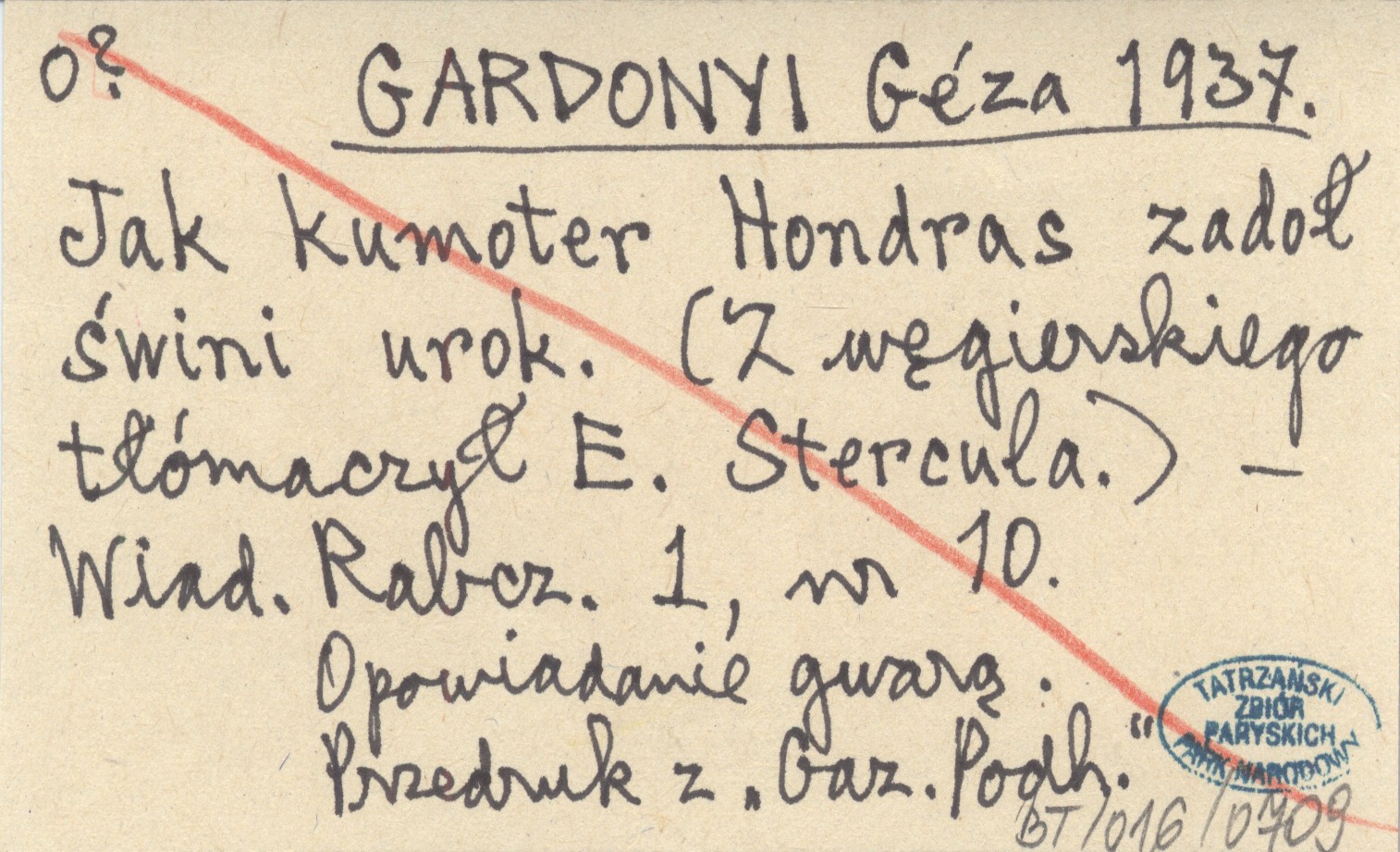 GARDONYI Géza 1937 Jak kumoter Hondras zadoł świni urok. (Z węgierskiego tłómaczył E. Stercula.).