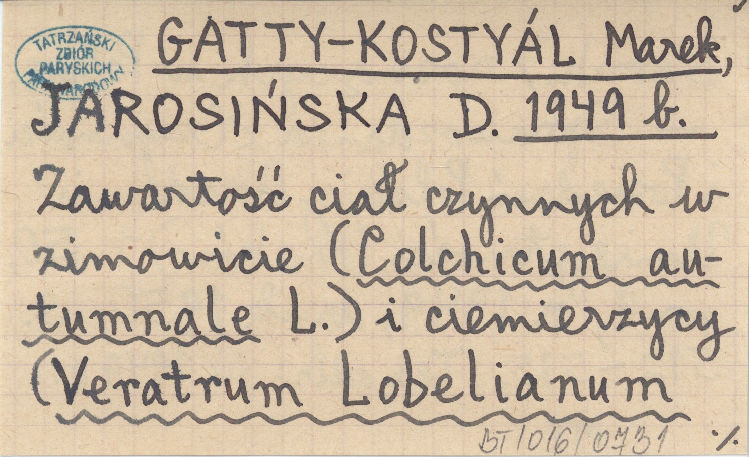 GATTY-KOSTYÁL Marek JAROSIŃSKA, D. ; 1949 b Zawartość ciał czynnych w zimowicie (Colchicum autumnale L.) i ciemierzycy (Veratrum Lobelianum Bernh.) rosnących w Polsce.