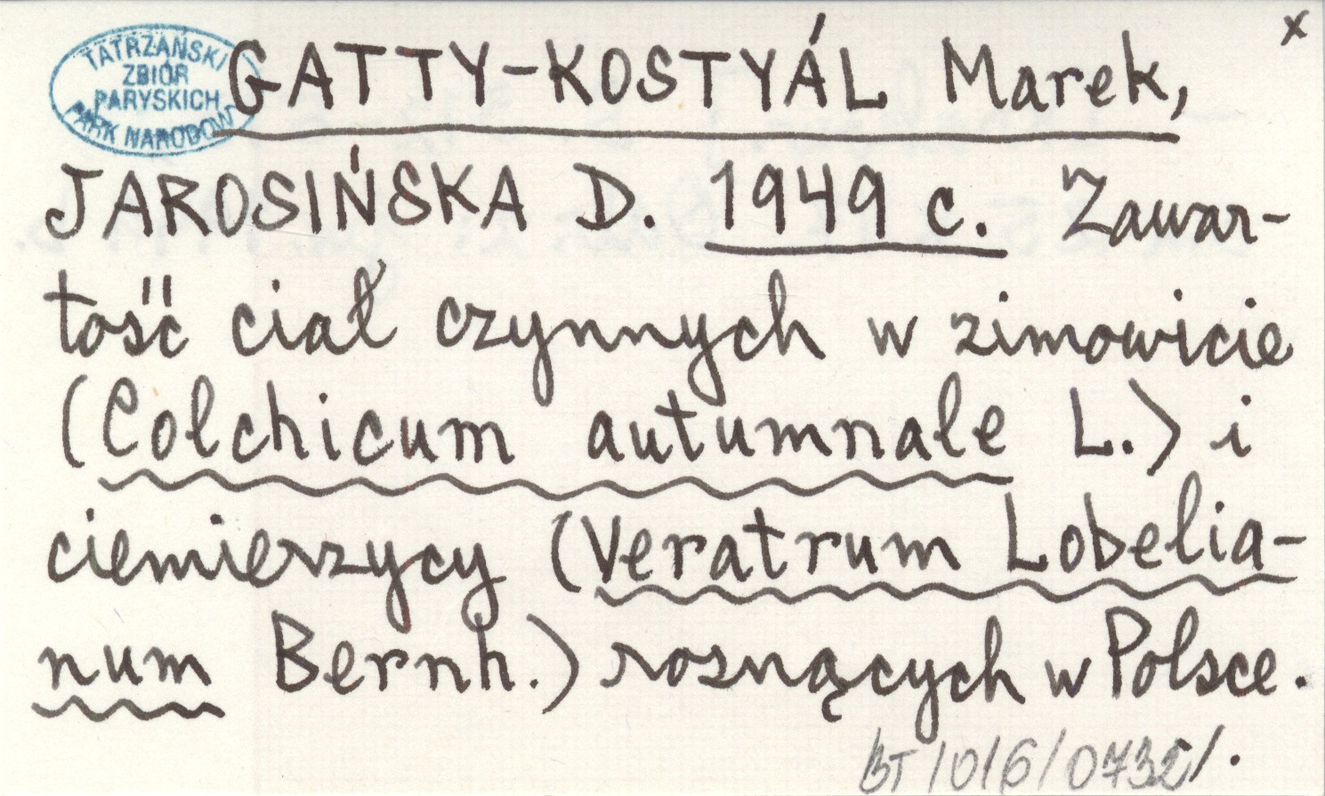 GATTY-KOSTYÁL Marek JAROSIŃSKA, D. ; 1949 c Zawartość ciał czynnych w zimowicie (Colchicum autumnale L.) i ciemierzycy (Veratrum Lobelianum Bernh.) rosnących w Polsce.