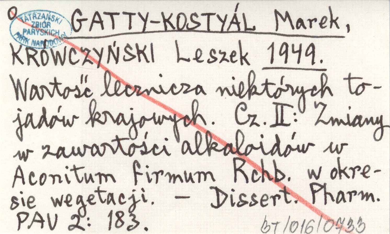 GATTY-KOSTYÁL Marek KRÓWCZYŃSKI, Leszek. ; 1949 Wartość lecznicza niektórych tojadów krajowych. Cz. II: Zmiany w zawartości alkaloidów w Aconitum firmum Rchb. w okresie wegetacji.
