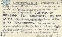GATTY-KOSTYÁL Marek STAWOWCZYK, Adolf. ; 1956 Zawartość ciał czynnych w ostróżce tatrzańskiej (Delphinium oxysepalum Borb. et Pax) i ich toksyczność. Coderžanie aktivnych tel živokosti iz gor Tatry (Delphinium oxysepalum Borb. et Pax) i ich toksičinost'. The content of active substances in the Tatra larkspur (Delphinium oxysepalum Borb. et Pax) and their toxicity.