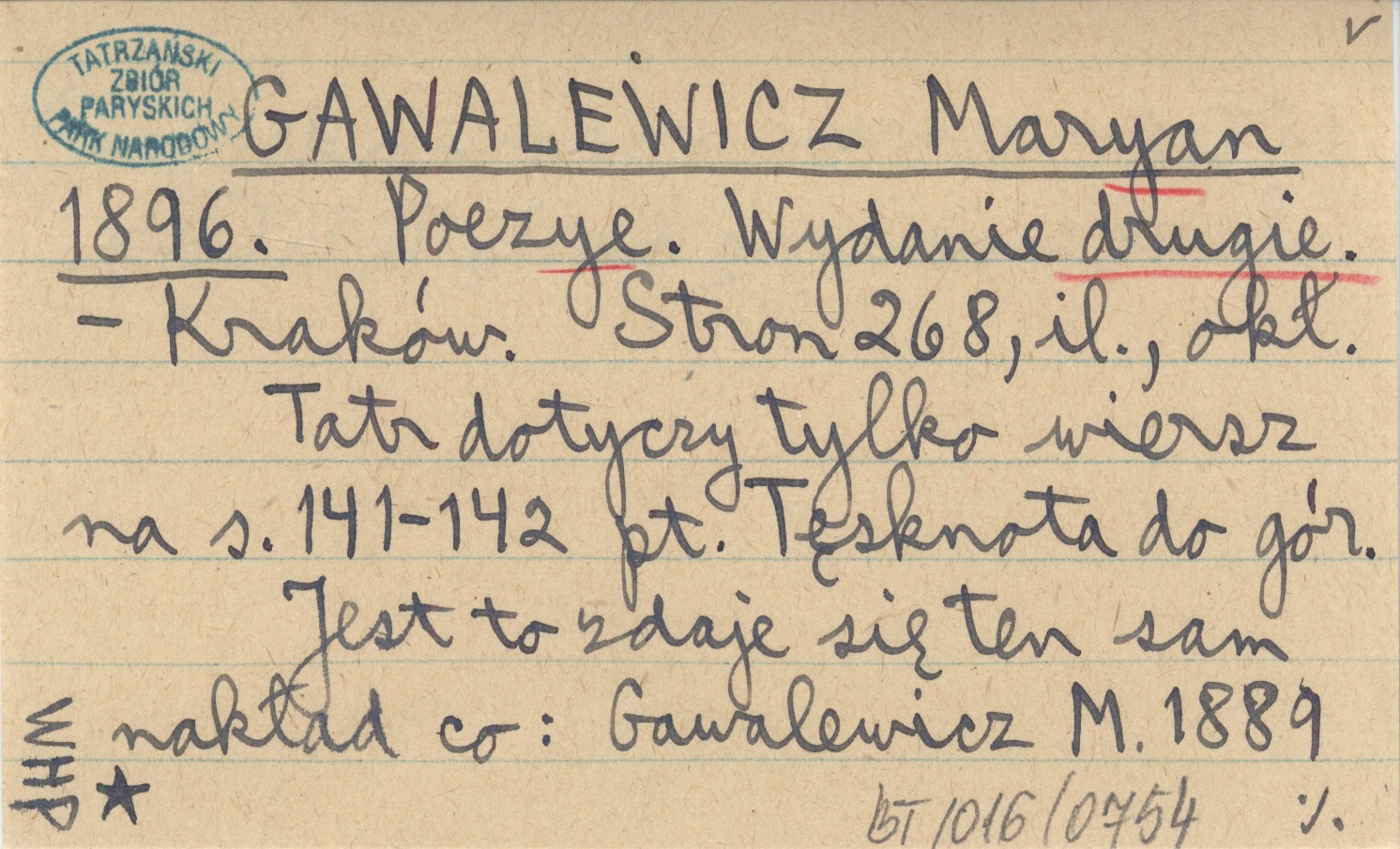 WYD: 2 Kraków , 268 s., il., okł. Tatr dotyczy tylko wiersz na s. 141-142 pt. Tęsknota do gór. Jest to zdaje się ten sam nakład co: Gawalewicz M. 1889 (i też nazwane wydaniem drugim), ale ze zmienioną kartą tytułową.
