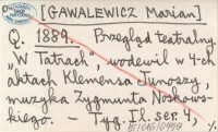 Q. [GAWALEWICZ Marian] 1889 Przegląd teatralny. "W Tatrach", wodewil w 4-ch aktach Klemensa Junoszy, muzyka Zygmunta Noskowskiego.