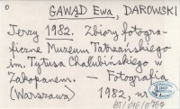 GAWĄD Ewa DAROWSKI, Jerzy. ; 1982 Zbiory fotograficzne Muzeum Tatrzańskiego im. Tytusa Chałubińskiego w Zakopanem.