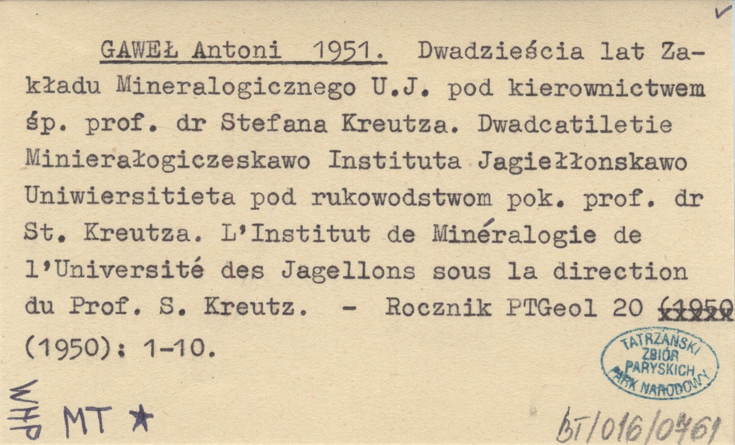 GAWEŁ Antoni 1951 Dwadzieścia lat Zakładu Mineralogicznego U.J. pod kierownictwem śp. prof. dr Stefana Kreutza. Dwadcatiletie Minierałogiczeskawo Instituta Jagiełłonskawo Uniwiersitieta pod rukowodstwom pok. prof. dr St. Kreutza. L'Institut de Minéralogie de l'Université des Jagellons sous la direction du Prof. S. Kreutz.