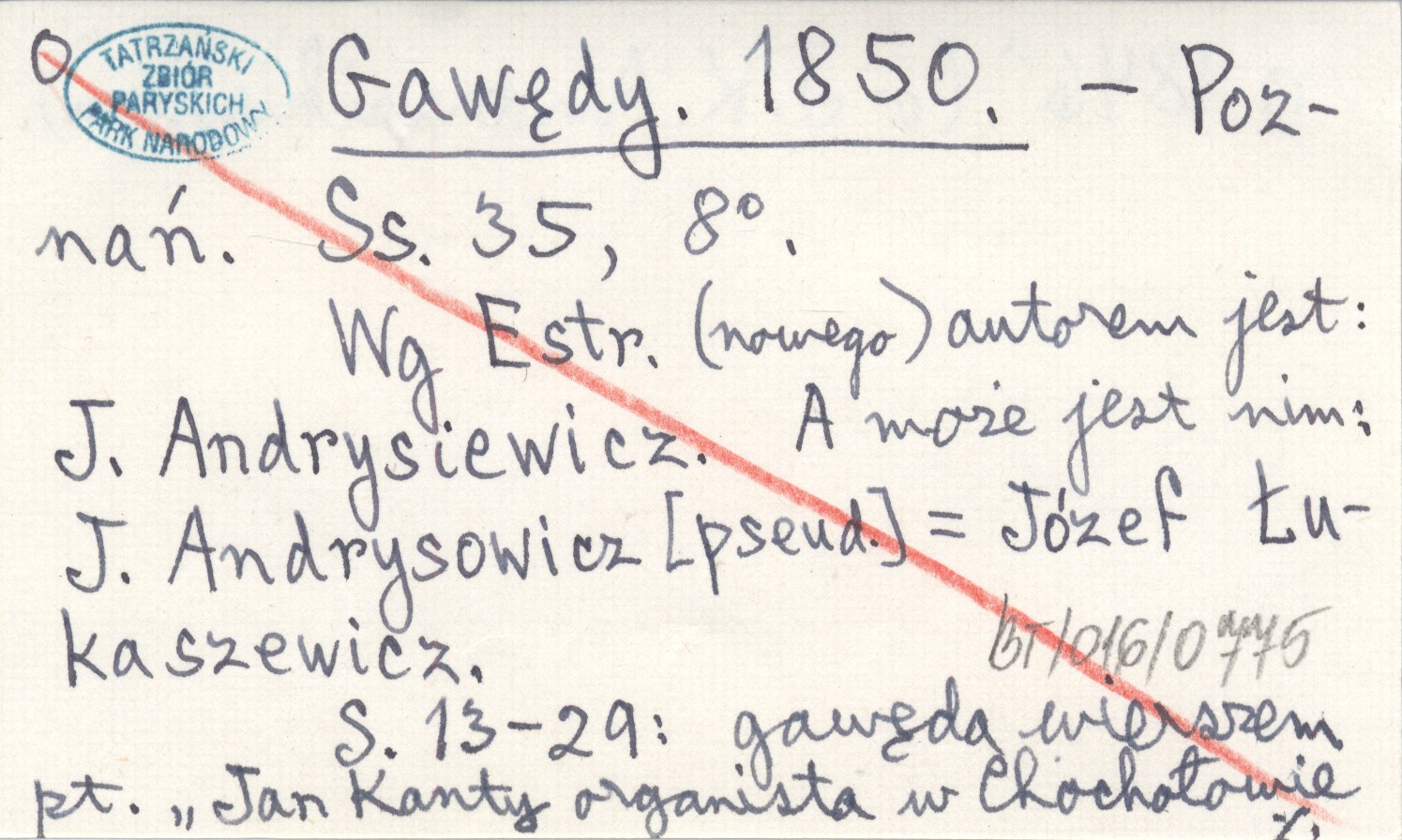 Poznań , 35 s., 8°. S. 13-29: gawęda wierszem pt. "Jan Kanty organista w Chochołowie r. 1846" (o J. K. Andrusikiewiczu). Wg Estr. (nowego) autorem jest: J. Andrysiewicz. A może jest nim: J. Andrysowicz [pseud.] = Józef Łukaszewicz. REC: Prz. Pozn. 10 (1850): 762-764