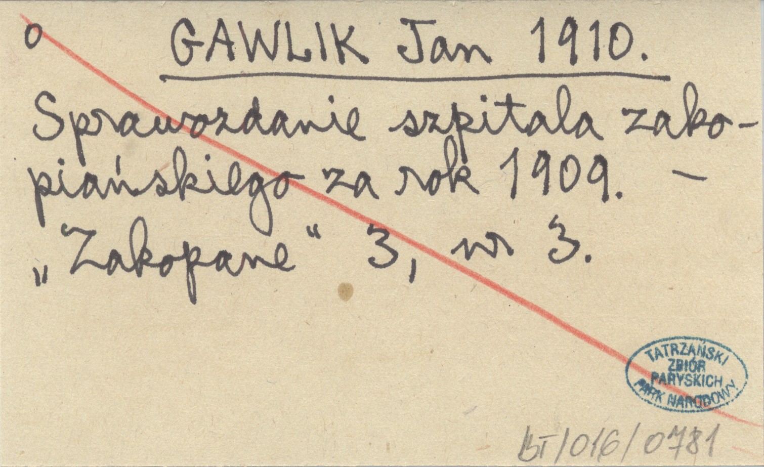GAWLIK Jan 1910 Sprawozdanie szpitala zakopiańskiego za rok 1909.