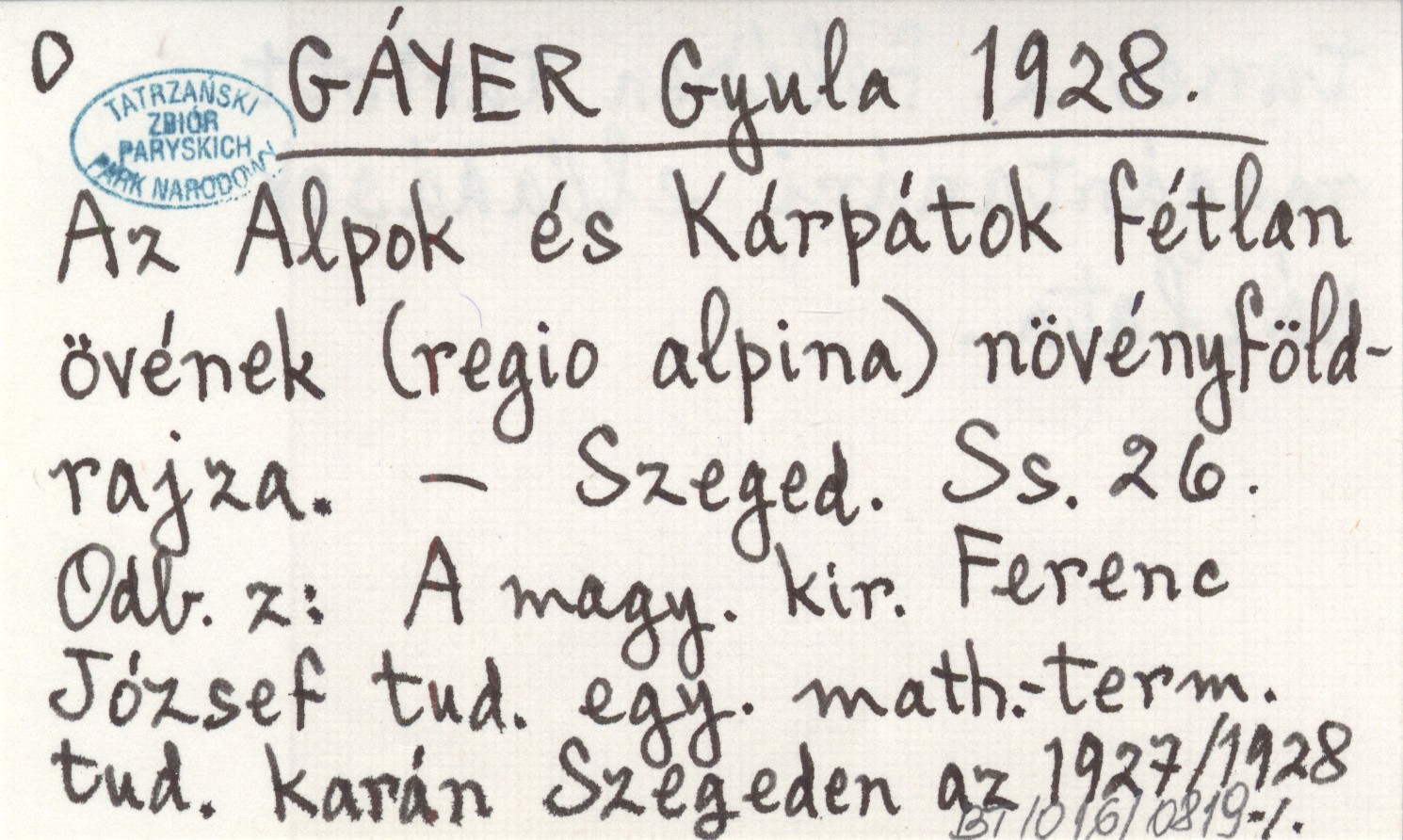 GÁYER Gyula 1928 Az Alpok és Kárpátok fétlan övének (regio alpina) növényföldrajza.
