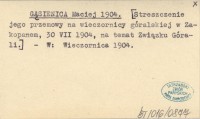 GˇSIENICA Maciej 1904 [Streszczenie jego przemowy na wieczornicy góralskiej w Zakopanem, 30 VII 1904, na temat Zwi±zku Górali.].