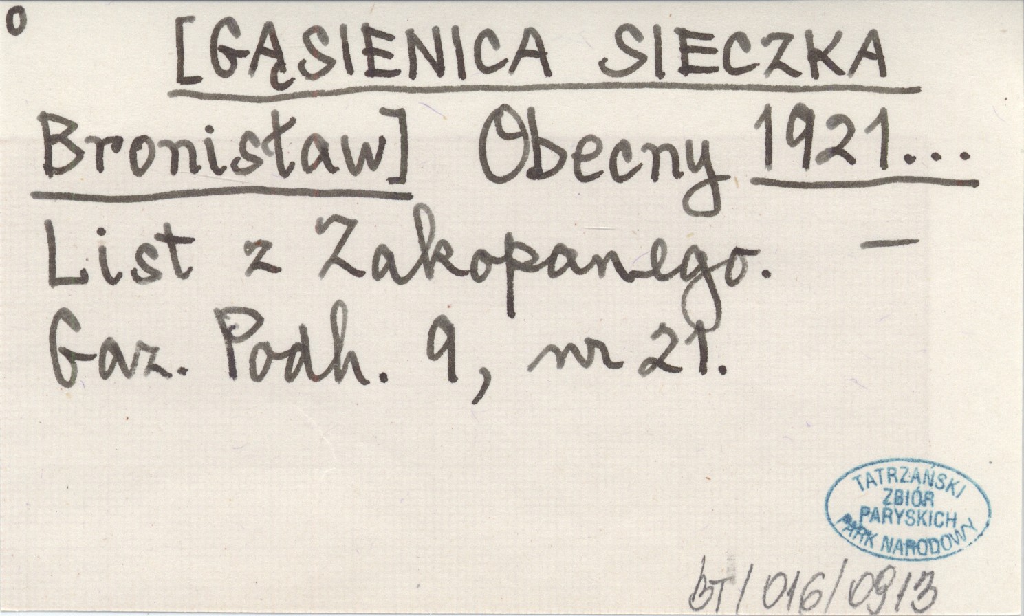 Obecny [GĄSIENICA SIECZKA Bronisław] 1921... List z Zakopanego.