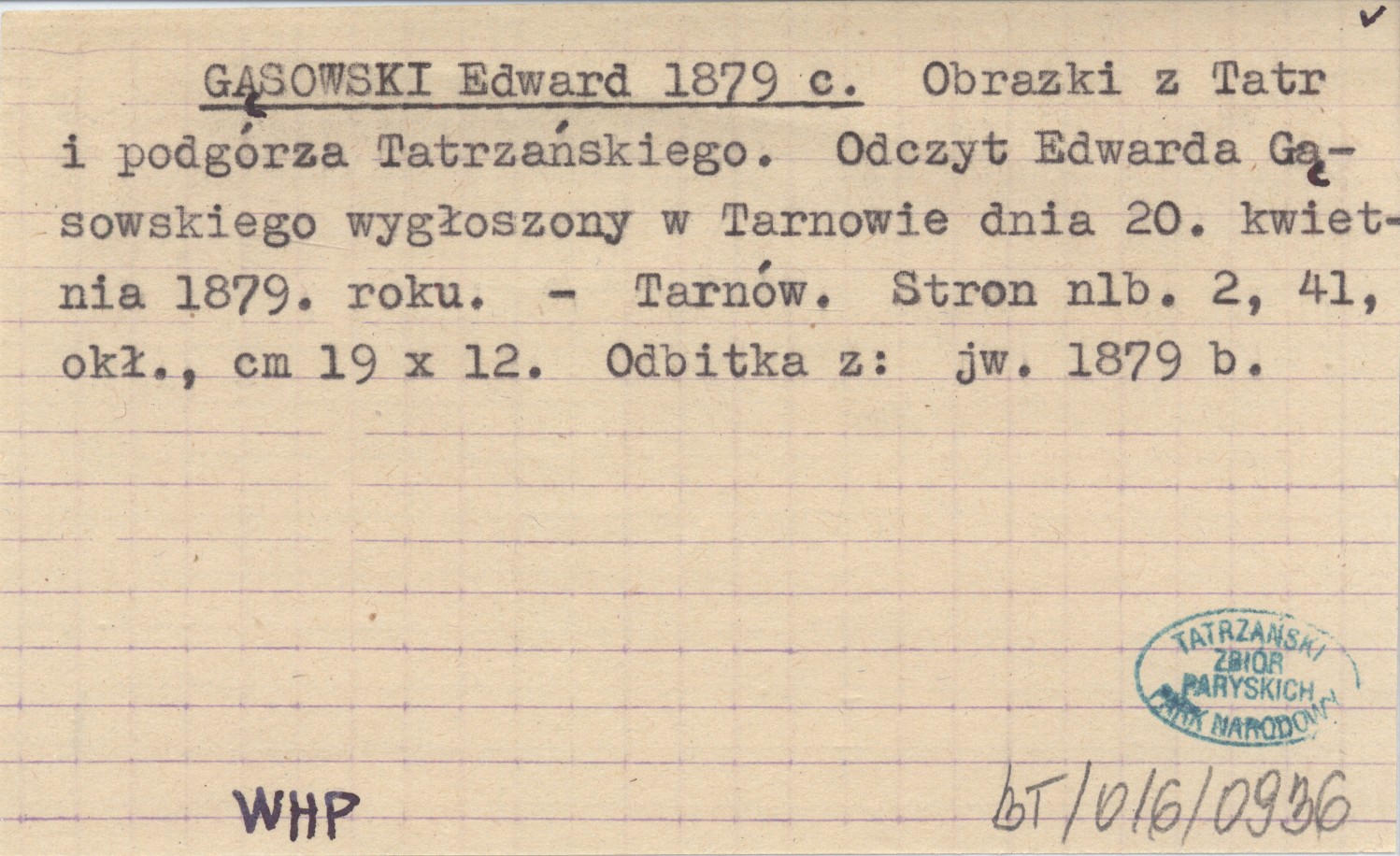 GˇSOWSKI Edward 1879 c Obrazki z Tatr i podgórza Tatrzańskiego. Odczyt Edwarda G±sowskiego wygłoszony w Tarnowie dnia 20. kwietnia 1879. roku.