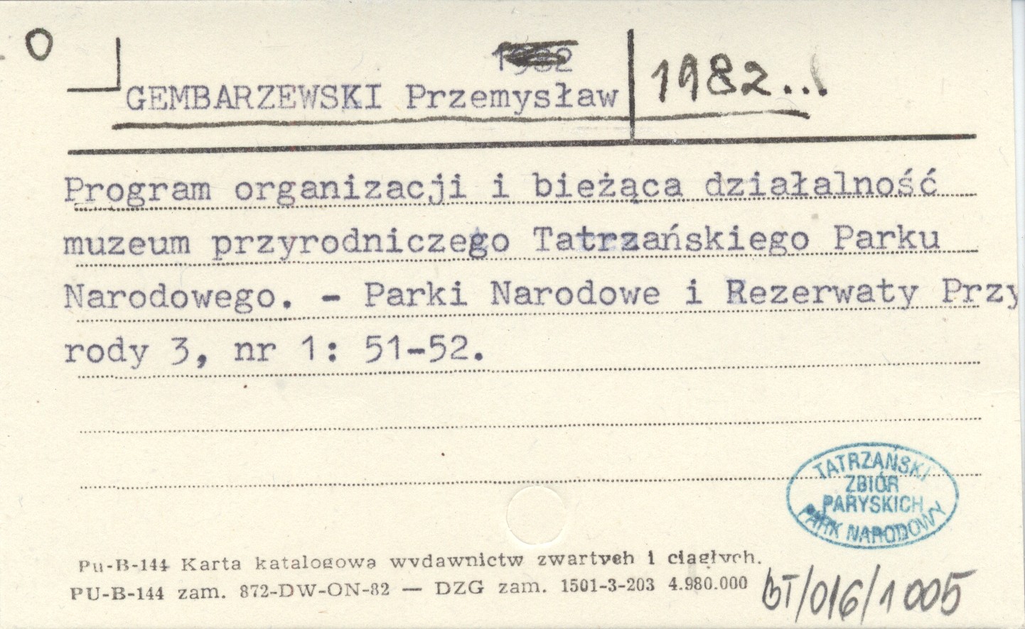 GEMBARZEWSKI Przemysław 1982... Program organizacji i bieżąca działalność muzeum przyrodniczego Tatrzańskiego Parku Narodowego.